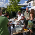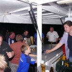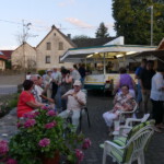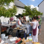 Natürlich war auch für das leibliche Wohl bestens gesorgt. Am „Schlemmisch Hoff“ waren ein Getränkepavillion, eine Grillstation mit Verkaufsstand und Tische und Bänke zum Verweilen aufgestellt. Es wurde Kartoffelsuppe gekocht, Reibekuchen gebacken, Steaks und Würstchen gegrillt und verkauft. Nach tagsüber hochsommerlichen Temperaturen von mehr als 30° Celsius füllte sich gegen Abend der Dorfplatz mit weiteren Besuchern zum gemütlichen Beisammensein. Zur musikalischen Unterhaltung während des Abends gab es handgemachte Musik. Der „Holzen“ (Matthias Peter) spielte auf seinem Akkordeon. Die Stimmung war gut und es wurden die allbekannten Stimmungslieder gesungen.